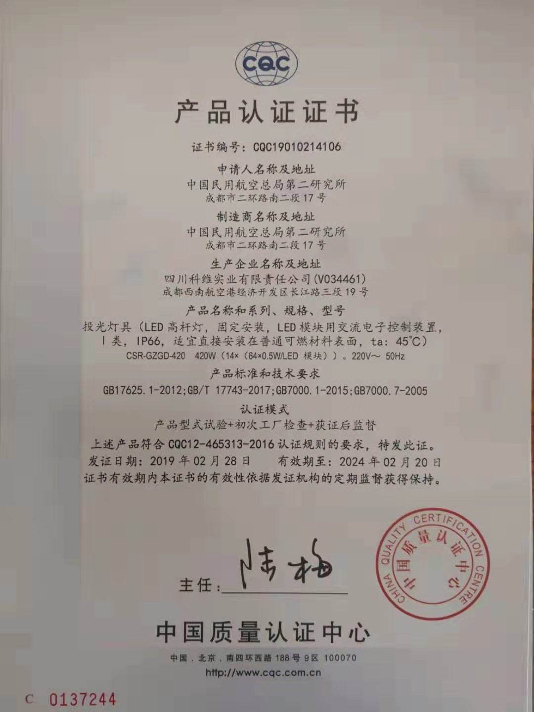 热烈祝贺中国民航局第二研究所获得灯具CQC标志认证