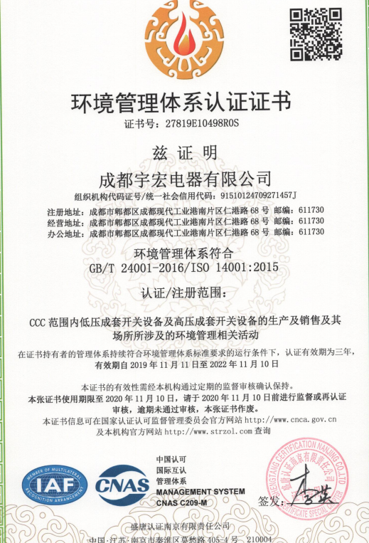 热烈祝贺成都宇宏电器有限公司取得ISO9001/1800/1400/三体系认证证书