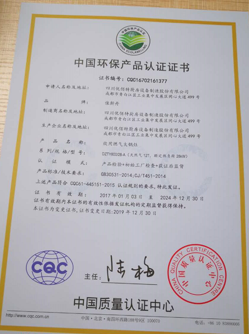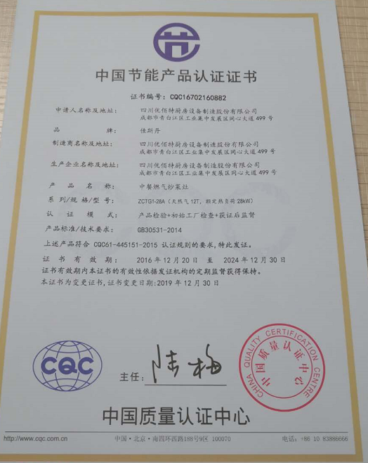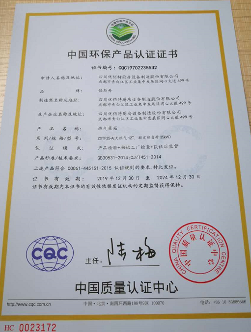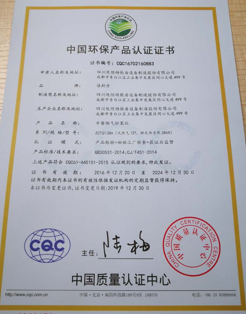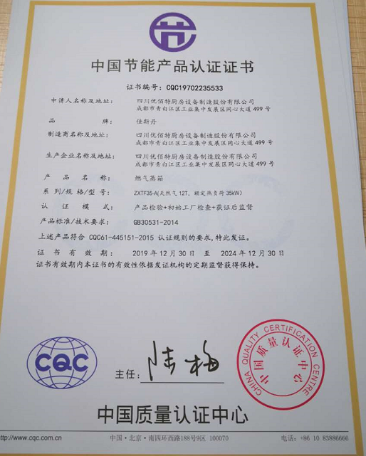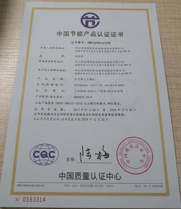 热烈祝贺四川优佰特厨具设备制造股份有限公司取得中国环保产品认证证书、中国节能产品认证证书