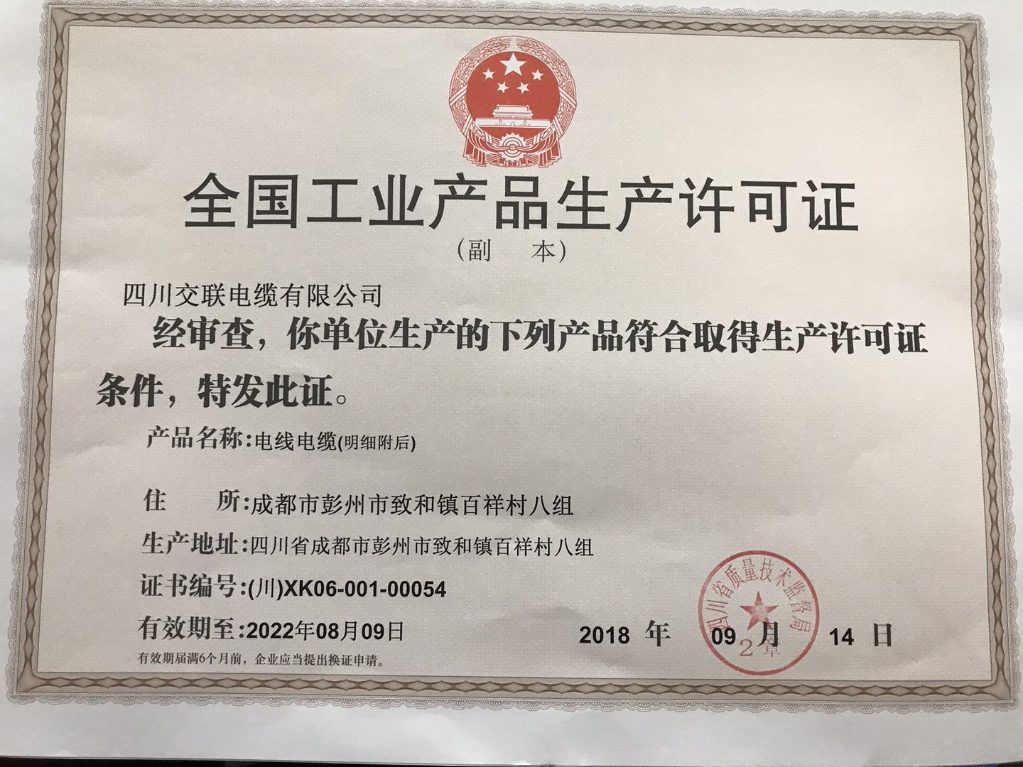 热烈祝贺四川交联电缆有限公司取得生产许可证