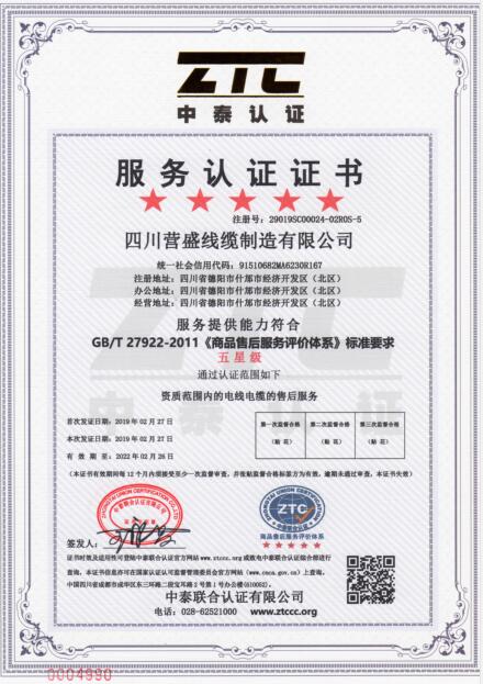 热烈祝贺四川营盛线缆制造有限公司获得商品售后服务(五星级)认证证书