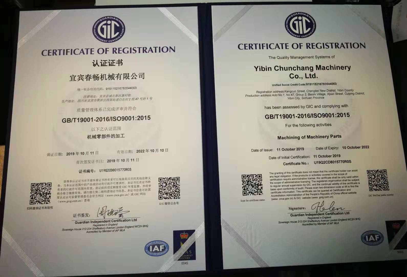 热烈祝贺宜宾春畅机械有限公司取得ISO9001认证证书