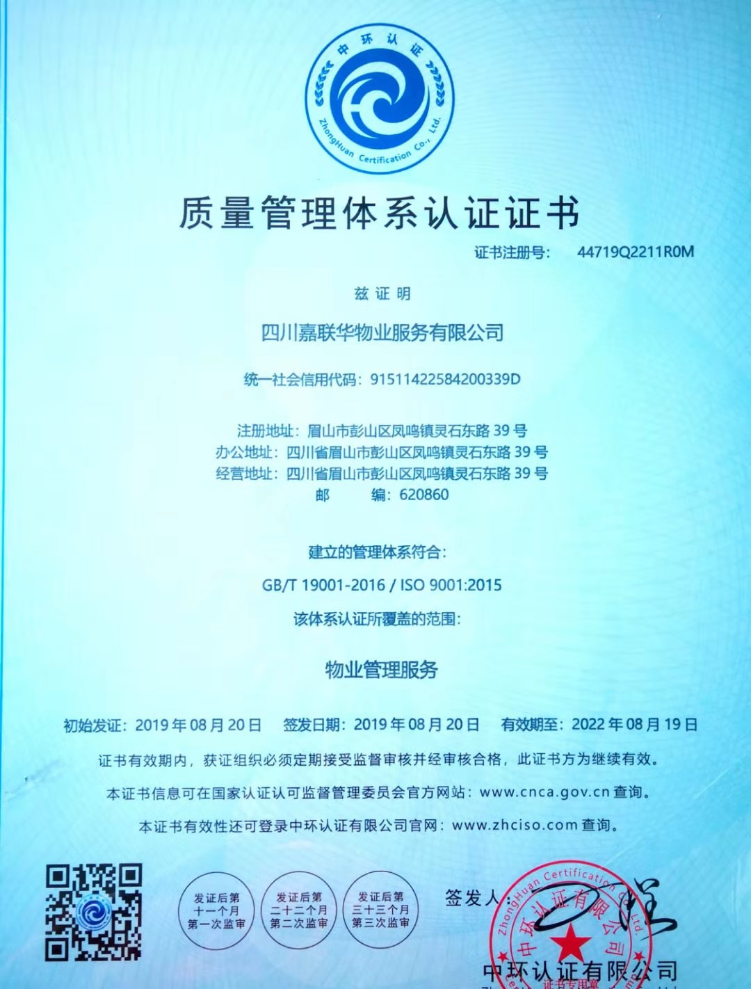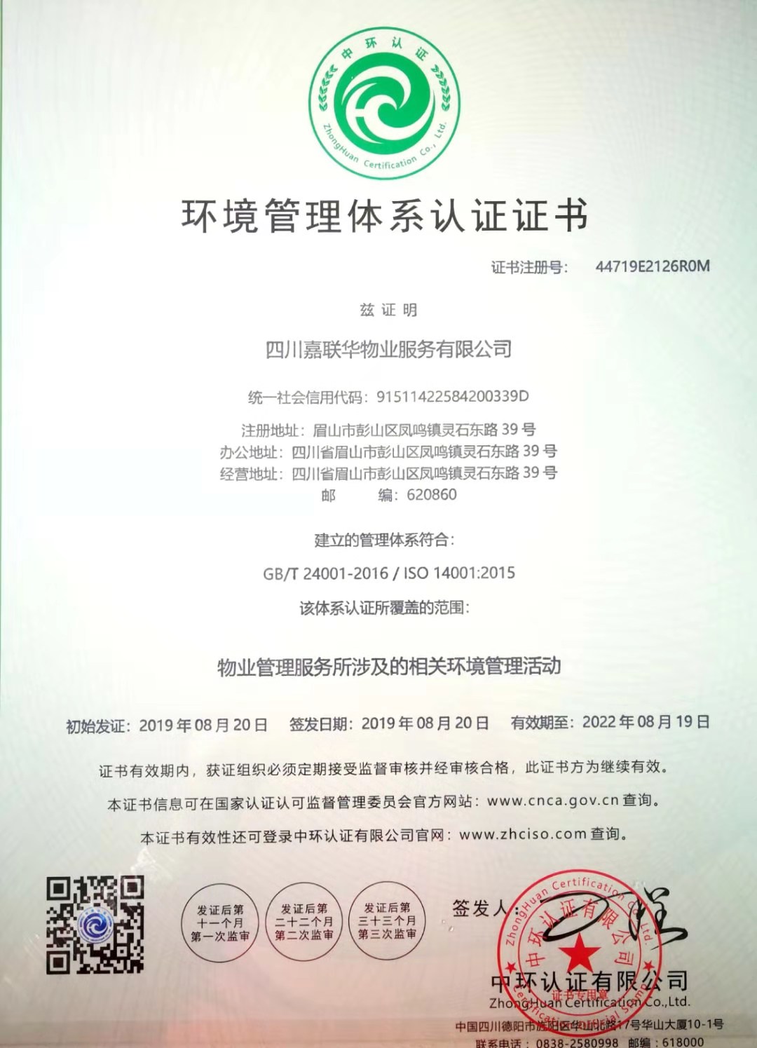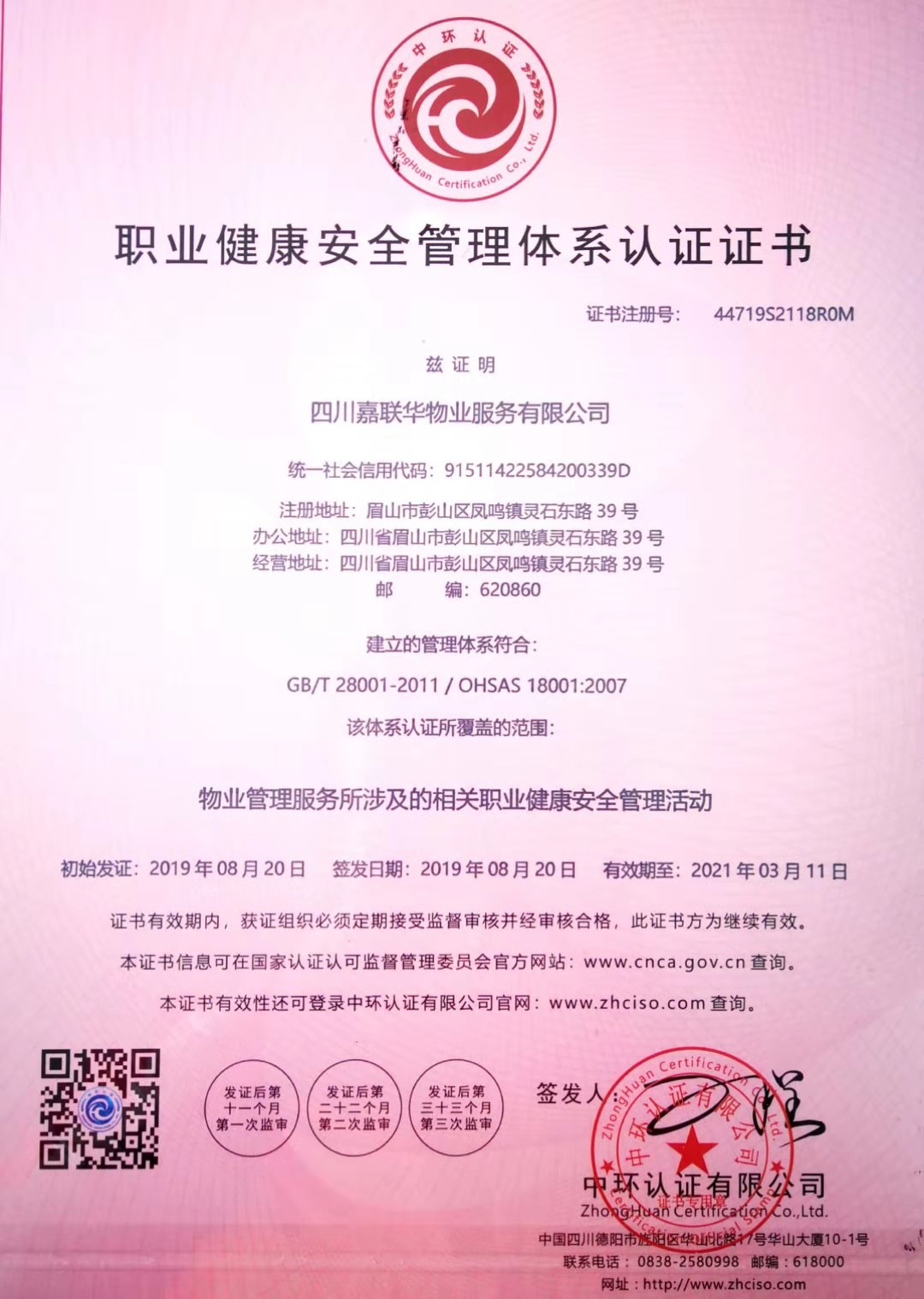 热烈祝贺四川嘉年华物业服务有限公司取得三体系ISO9001/1800/1400认证证书
